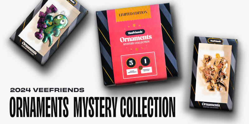 In November 2024, VeeFriends released its first-ever Ornaments Mystery Collection, featuring sculpted metal ornaments packaged in cases of five mystery designs. Each case included four regular ornaments, one golden ornament, and a bonus Entrepreneur Elf Super Sticker.