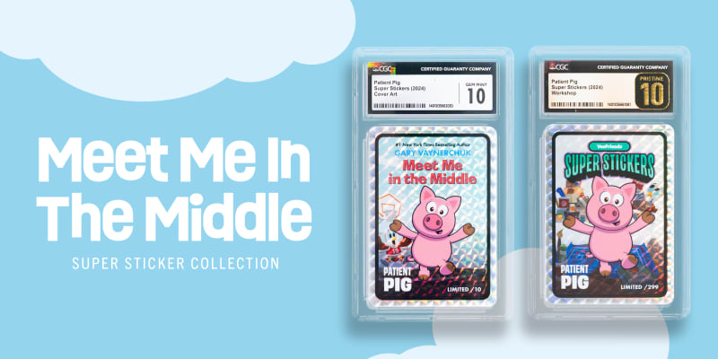 The Meet Me in the Middle Super Sticker Collection celebrated the launch of VeeFriends’ first children’s book with a limited-edition collectible bundle. The release included a Booklet Pin inspired by the story, featuring both Patient Pig and Eager Eagle in a design that reflected the book’s dual-perspective theme. The pin was paired with a CGC-graded Patient Pig Super Sticker, offering added value for collectors.