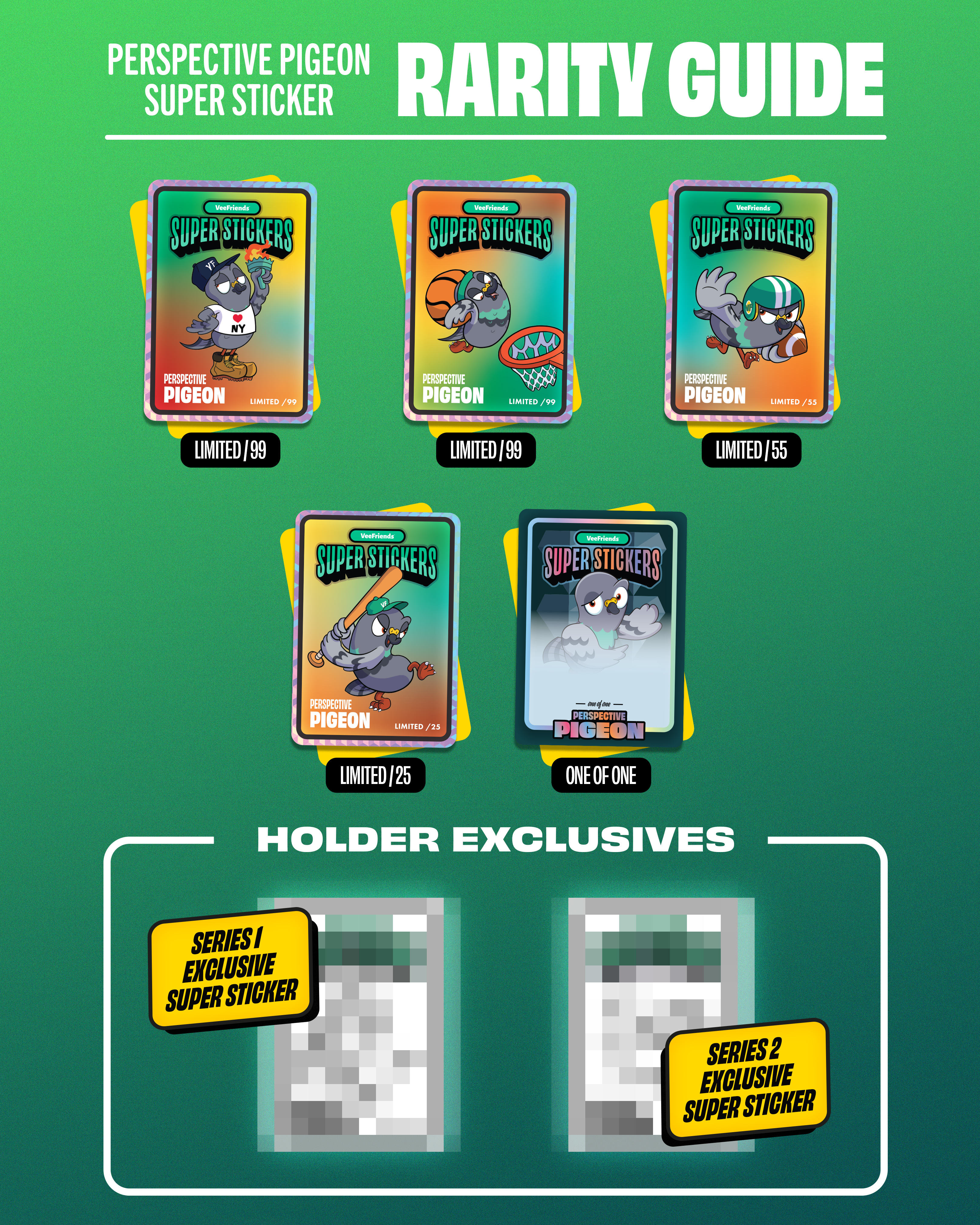 The Perspective Pigeon Super Sticker Collection debuted exclusively at Fanatics Fest NYC 2024, offering fans a collectible tied to one of VeeFriends’ most iconic characters. The drop featured seven total rarity variants, with five available only to attendees at the event, making them highly sought-after by collectors. This release captured the spirit of limited drops, character expression, and in-person community engagement.
