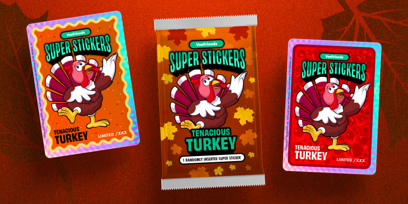 The Tenacious Turkey Super Sticker offered VeeFriends NFT holders a 24-hour collectible pre-order. Each pack included one sticker in seven possible rarities, featuring festive editions like Pumpkin Pie, Cranberry, and Gravy. This was the first Super Sticker available to all VeeFriends holders.