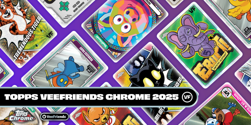 Topps VeeFriends Chrome 2025 was released on May 7, 2025 as the first-ever VeeFriends trading card set printed on premium Topps Chrome stock. Each set features 100 VeeFriends characters with collectible base cards, rare parallels, autograph cards, and original sketch cards. Every set came in a Hobby or Blaster box and offered exclusive chase cards.