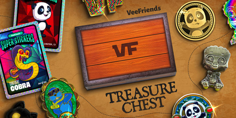 The VeeFriends Treasure Chest is a premium collectible box featuring 21 VeeFriends characters across Gemstone Pins with real sapphires, NGC-graded coins, debut Sapphire Super Stickers, and Classic Pins across ultra-limited rarities. With only 5,555 boxes available, every unboxing delivers luxury craftsmanship and chase potential.