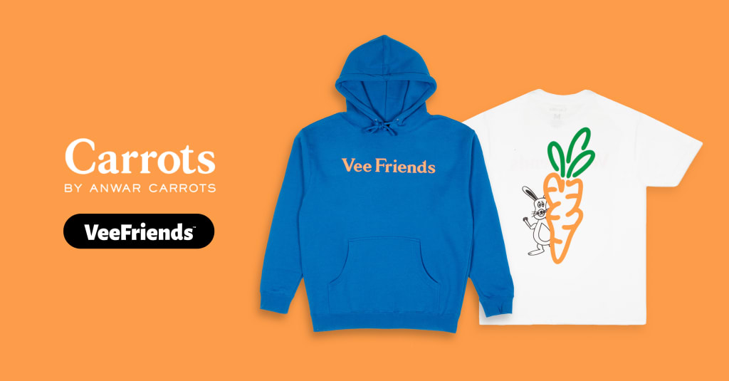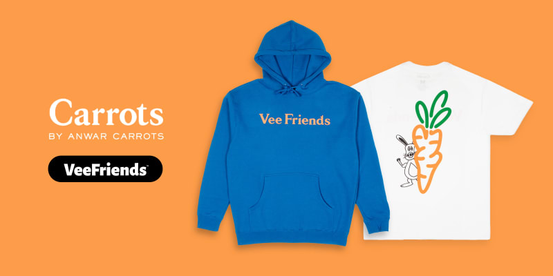 The Winter ’21 collaboration between Anwar Carrots and VeeFriends brought the Self-Aware Hare character to life on limited-edition streetwear. Anwar Carrots, known for his LA-based brand, designed a relaxed-fit T-shirt and hoodie. The apparel was made available at select Nordstrom locations and Carrots' website, which sold out quickly.