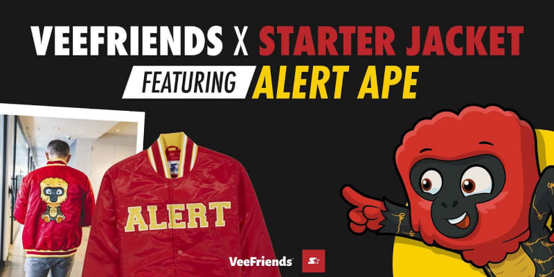 VeeFriends partnered with iconic sportswear brand Starter to release the limited edition Alert Ape Jacket. Inspired by the VeeFriends character Alert Ape, this jacket features custom embroidered appliques on a red and yellow satin design.