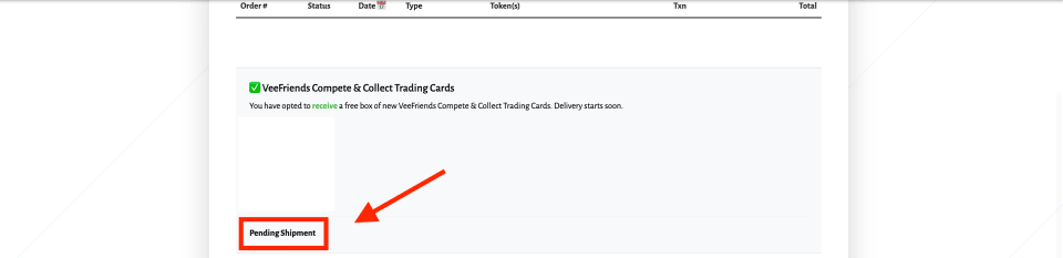 If you do not see any tracking information yet and have opted-in to receive VeeFriends "Compete and Collect" Trading Cards you will see a "Pending Shipment" status. Pending shipment means your order is in line to be shipped. Once your cards have been shipped you will receive an email notification and have your FedEx tracking information listed in your Order History.