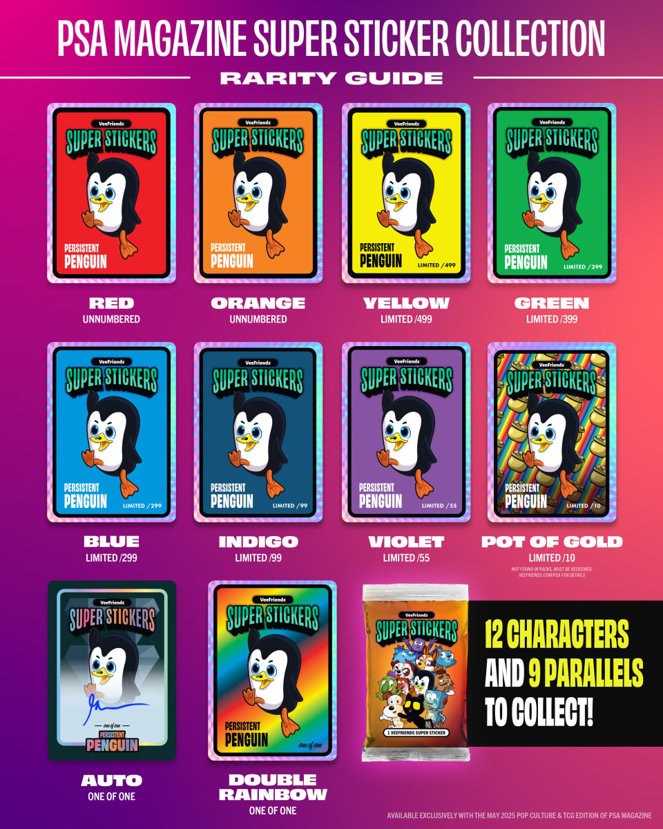 The Super Stickers collection debuted in the May 2025 issue of PSA Magazine, offering collectors a chance to secure exclusive VeeFriends stickers in a range of exciting rarities. Each issue included one Super Sticker featuring 1 of 12 VeeFriends characters, marking a milestone in the VeeFriends collectibles universe.