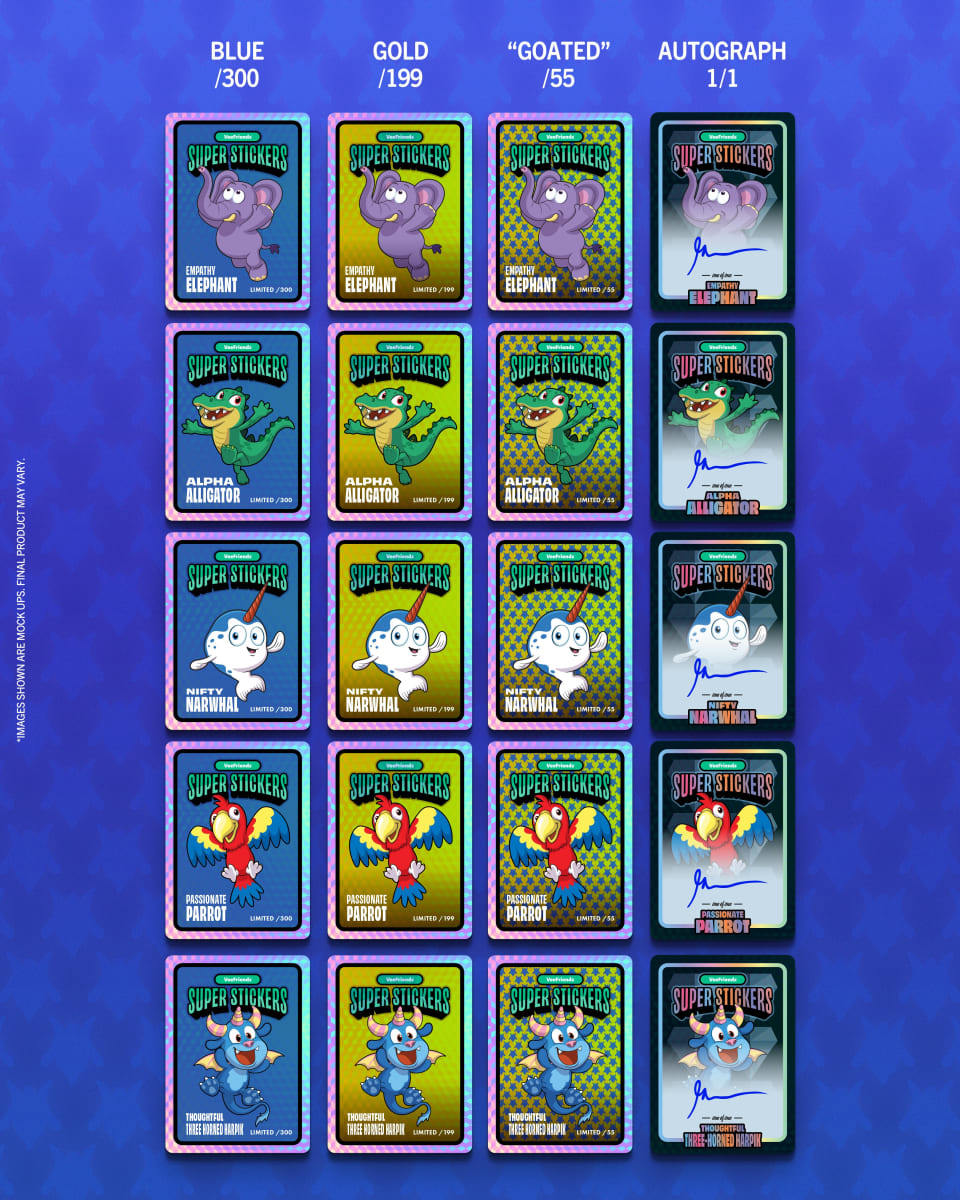 Super Stickers: Manga Series Base Set Characters: Adventurous Astronaut, Ambitious Angel, Amped Aye Aye, Articulate Armadillo, Aspiring Alpaca, Bashful Blobfish, Benevolent Barn Owl, Big Game Bandicoot, Boisterous Beaver, Bullish Bull, Chill Chinchilla, Compassionate Catfish, Competitive Clown, Considerate Cowboy, Consistent Cougar, Decisive Duck, Determined Dolphin, Dialed In Dog, Driven Dragon, Eager Eagle, Entrepreneur Elf, Fearless Fairy, Flex'n Fox, Fly Firefly, Focused Falcon, Forever Phoenix, GaryVee, Generous Gerbil, Genuine Giraffe, Gracious Grizzly Bear, Happy Hermit Crab, Headstrong Honey Badger, Heart Trooper, Helpful Hippo, Hype Horse, Hungry Hammerhead, Hustling Hamster, Innovative Impala, Kind Warrior, Kindred Kangaroo, Likable Leopard, Logical Lion, Notorious Ninja, OG Ox, Patient Pig, Positive Porcupine, Protective Panther, Rare Robot, Resilient Red Devil, Tenacious Turkey, Tranquil Toad, Tremendous Tiger, Versatile Viking, Warm Wolverine, Willful Wizard