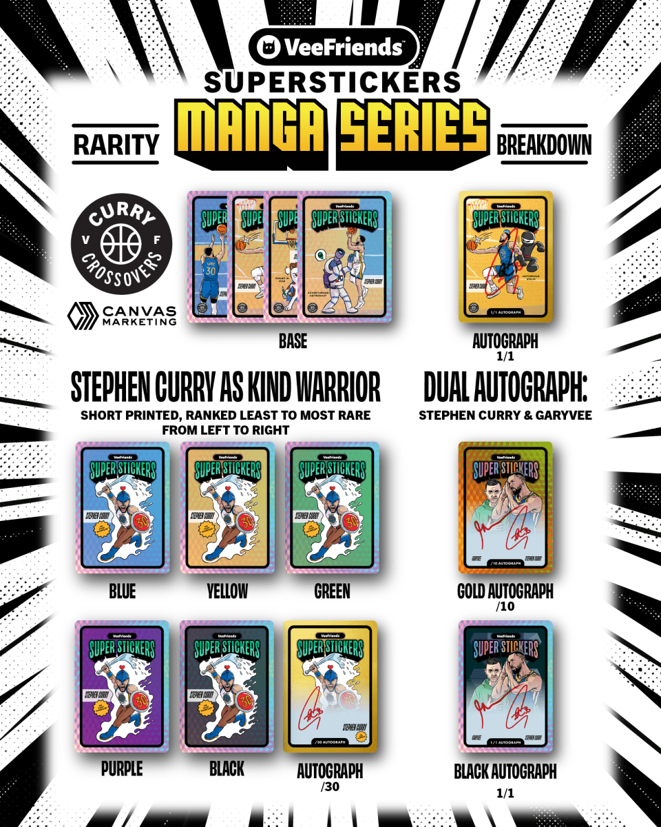 In August 2025, VeeFriends unveiled its first-ever sealed box release for Super Stickers with a groundbreaking crossover: Super Stickers: Manga Series, featuring global basketball icon Stephen Curry via Canvas Marketing.