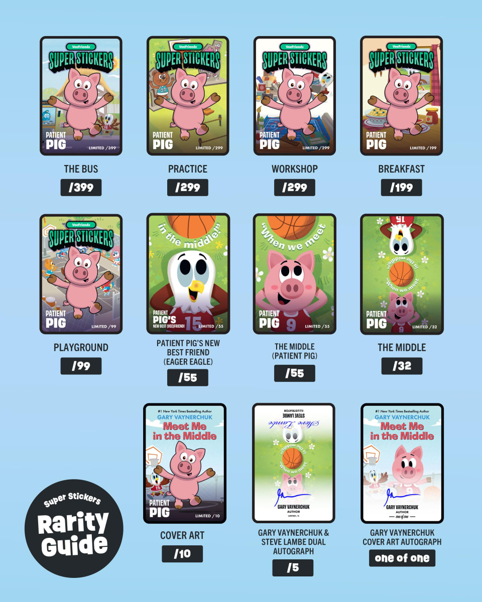 To celebrate the release of VeeFriends' first-ever children's book, Meet Me in the Middle, starring Patient Pig and Eager Eagle, VeeFriends and HarperCollins partnered with 10 local bookstores throughout the United States to produce a limited collection of CGC-Graded Patient Pig Super Stickers. These stickers were available as a gift with purchase, but only for the first 100 people to pre-order Meet Me in the Middle through the dedicated pages of these stores, while supplies lasted.