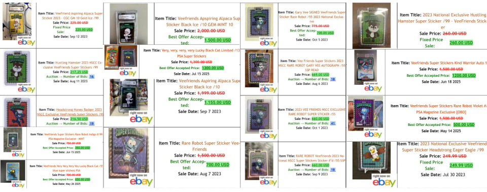 The inaugural VeeFriends Super Stickers first hit the scene and took center stage in July 2023 at the 2023 National Sports Collectors Convention (NSCC). Exclusively available to the convention's VIP attendees and vendors, these Super Stickers were a coveted addition to their collections. Each VIP bag included a complimentary Super Sticker, marked as "NSCC 2023 Exclusive." These limited edition stickers featured 19 unique characters, and here's a checklist of the characters you could find: