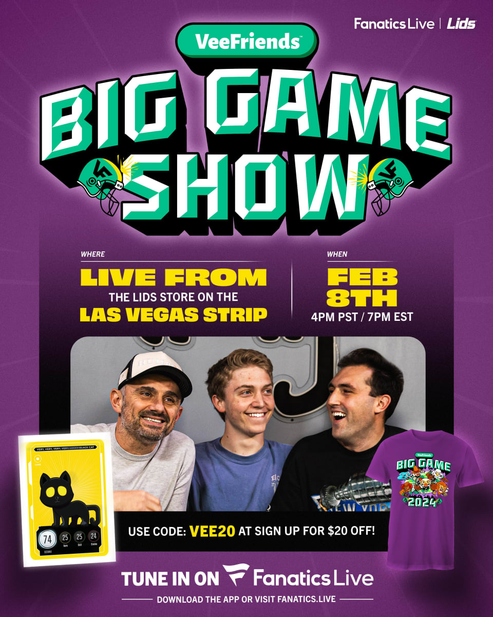 Calling all sports and VeeFriends enthusiasts alike! Get ready for an evening of electric entertainment at our BIGGEST live event yet — The Big Game Show! Streaming live from the Lids store on the Las Vegas strip this Thursday, February 8th at 4 PM PST / 7 PM EST, the Big Game Show is game planning for giveaways, surprises, access to exclusive products, card breaks, special guest appearances, and non-stop action. Use this blog as your scouting report to make sure you're front and center for all the action.