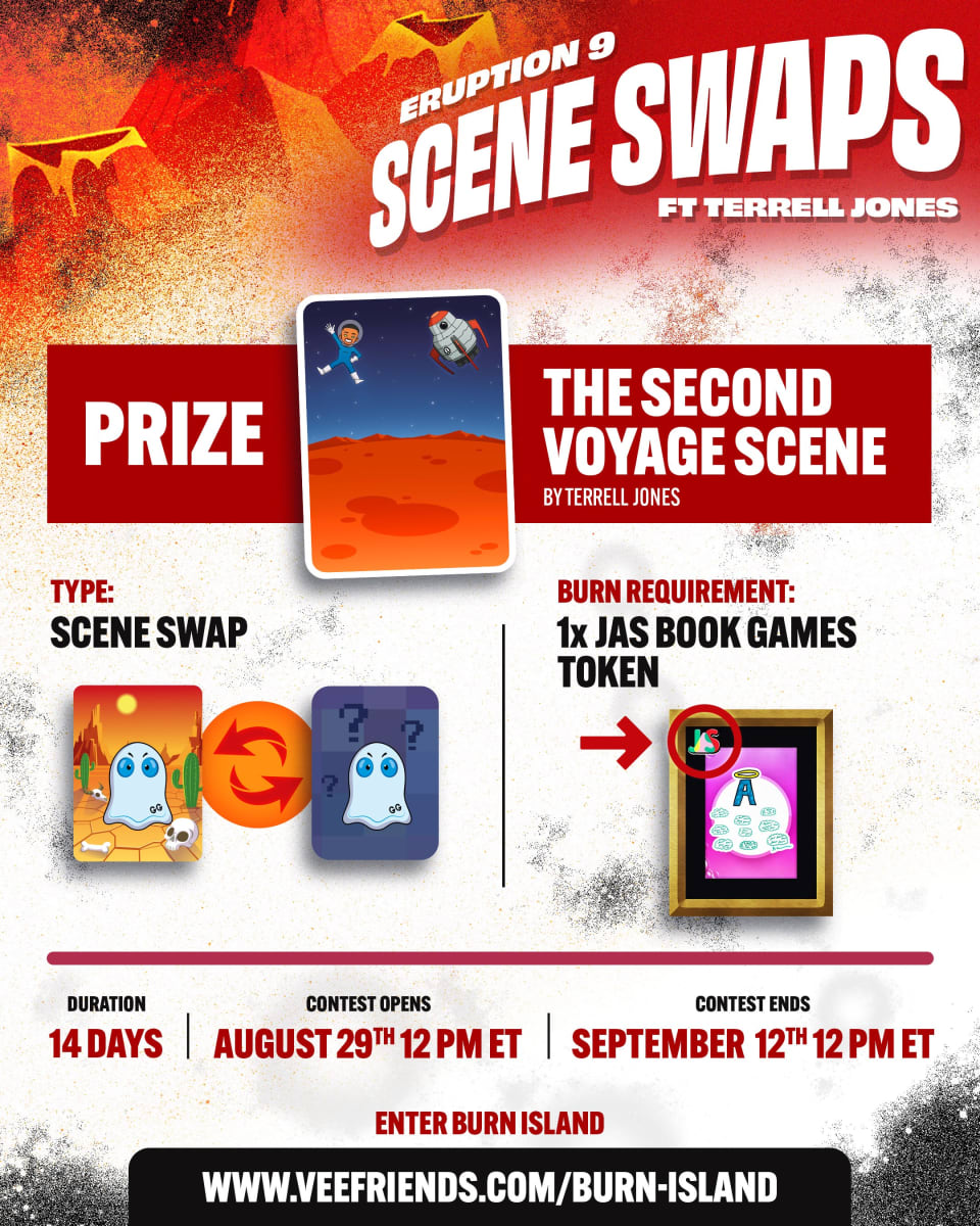 Burn Island Eruption 9 is introducing a hotter-than-lava reward to reshape the destiny of your VeeFriends token through Scene Swaps! This exciting mechanism empowers eligible VeeFriends holders to transform their tokens into unique collectibles featuring scenes designed by notable partners, brands, cultural entities, and renowned artists. These immersive backgrounds will adorn VeeFriends Series 2 tokens, adding an extra layer of individuality and excitement.