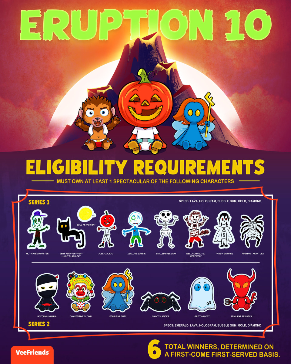Eligibility: To take part in Burn Island Eruption 10, you must ensure you meet the eligibility requirements. For this particular eruption, you need to own a select Series 1 or Series 2 VeeFriends token. Additionally, you must possess at least one (1) BOOK GAMES token and be among the first to participate.
