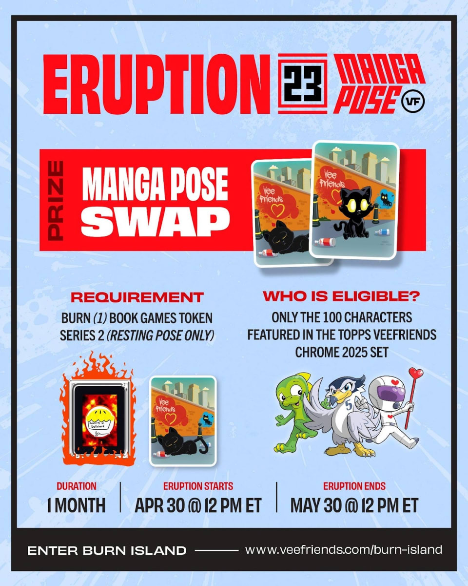 TYPE: Pose Swap REQUIREMENT: Eligible Series 2 (Resting Pose only) + 1 BOOK GAMES Token BURN: 1 BOOK GAMES Token PRIZE: Manga Pose ELIGIBLE CHARACTERS: Only the 100 characters featured in the Topps VeeFriends Chrome 2025 set DURATION: 30 Days ERUPTION START: Thursday, May 1 @ 12 PM ET ERUPTION END: Friday, May 30 @ 12 PM ET