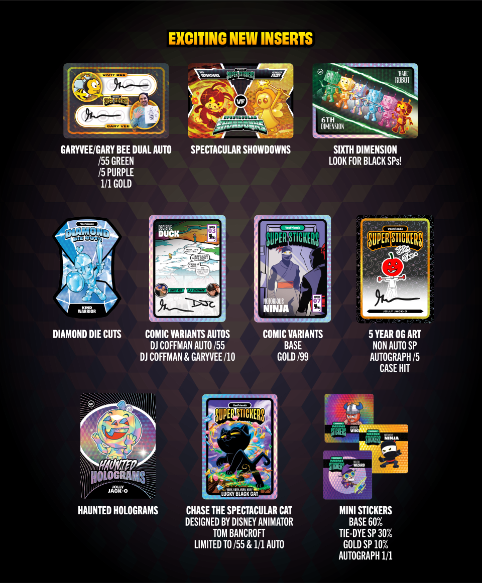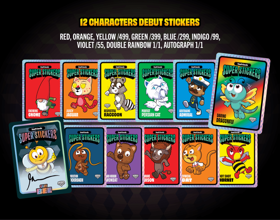 For the first time, inserts make their way into VeeFriends Super Stickers with eight distinctive subsets to collect, adding a variety of new exciting hunts for collectors.