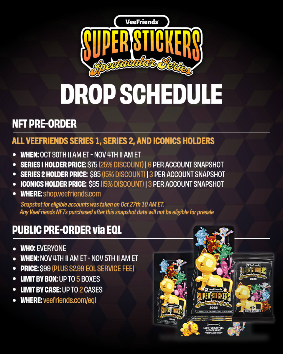 Eligible VeeFriends NFT holders will receive first and guaranteed access to pre-order boxes of 2026 Super Stickers: Spectacular Series through the gated pre-order window. Eligibility has been determined by a snapshot of token holders and VeeFriends accounts taken on Oct 27th, 10 AM ET. To clarify, any VeeFriends NFTs purchased after this snapshot date will not be eligible for pre-order.