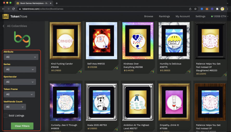 In TokenTrove, after you select the BOOK GAMES collection, you will notice token properties filters on the left-hand side to select for each, similar to looking at an individual collection on OpenSea. Let's define each below: