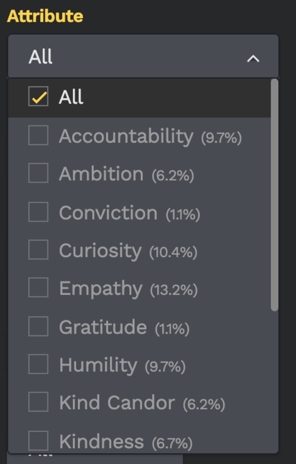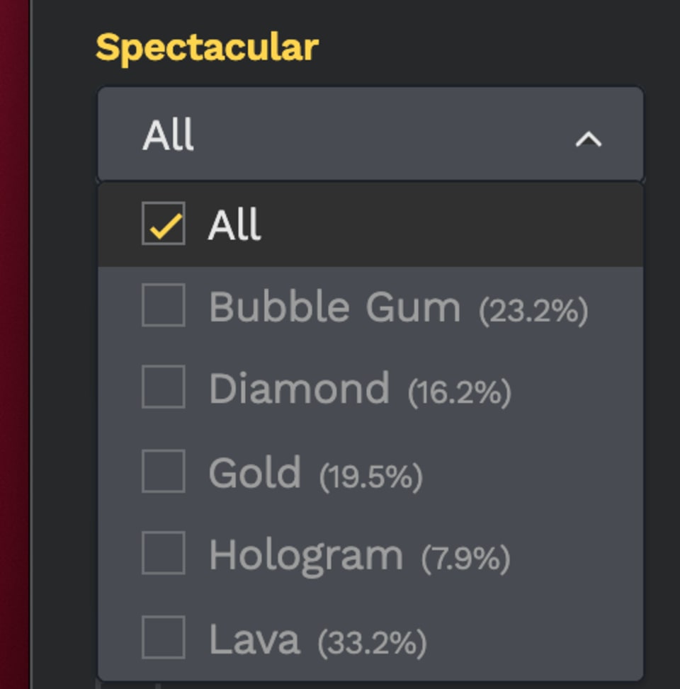 The "Attribute" section has all 13 artwork attributes available to select and filter to view, as we as a Special attribute which is specific to the 3 special artwork tokens.