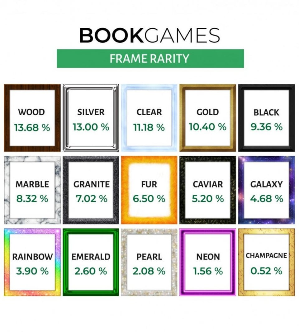 Including the different supply of BOOK GAMES artwork Spectacular rarities, there are also 15 different Frames with their own corresponding rarity.