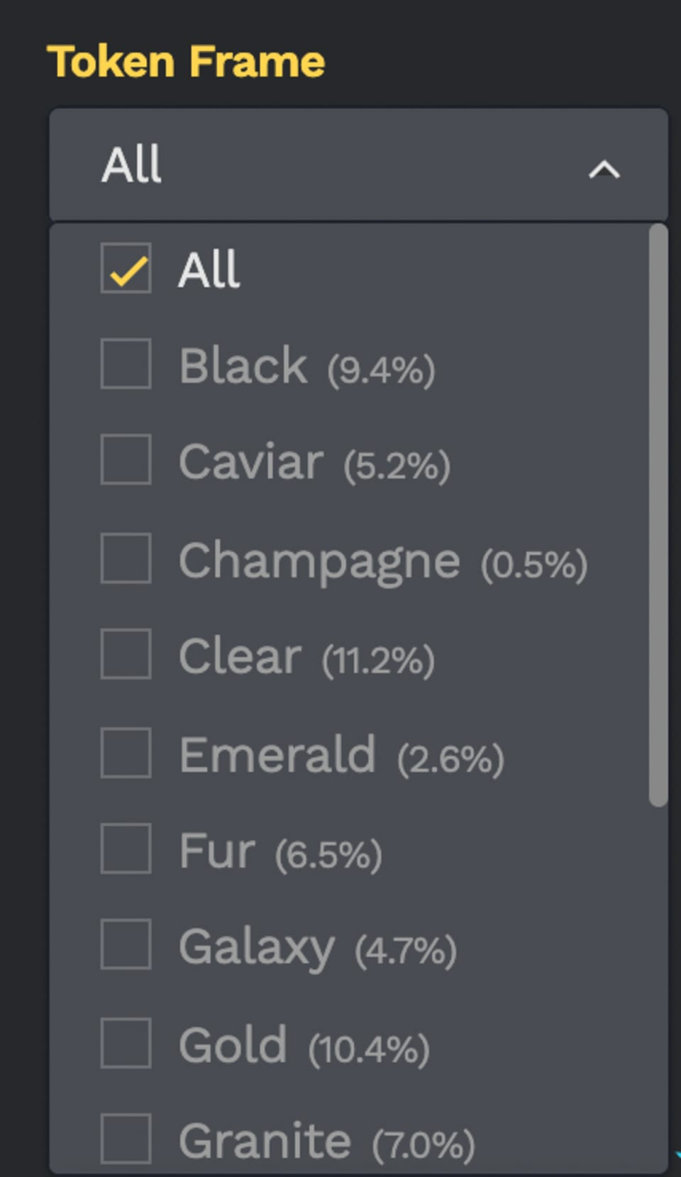 The Token Frame section has all 15 Frames according to their rarity, the most common frame is Wood (13.7%) and the most rare frame is Champagne (0.5%).