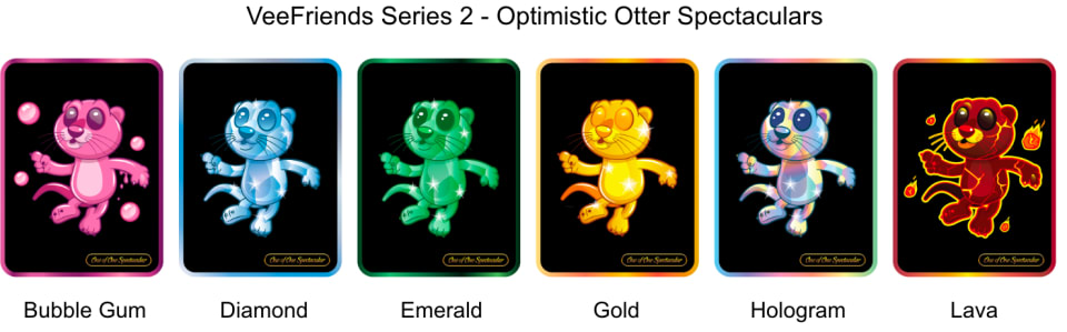 Spectaculars are 1 of 1 VeeFriends, and have consistently been the holy grail of the VeeFriends world. In Series 2, we've added a 6th Spectacular type - Emerald! All Series 2 Spectaculars can be found in their character's competing pose with their Spectacular Scene, featuring a clean black background and matching Spectacular outline.