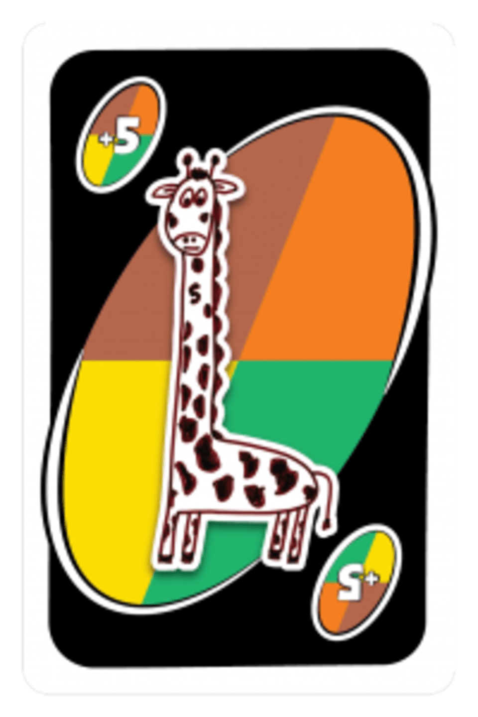Draw 5 Giraffe - This card can be used on your turn regardless of what is on the discard pile. The next player must draw 5 cards.