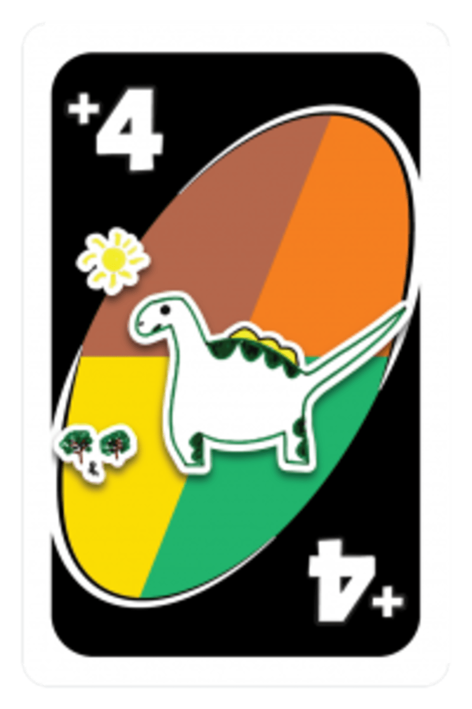 Draw Four Dinosaur - This card can be used on your turn regardless of what is on the discard pile. The next player must draw 4 cards. However, you can only play this card if you DO NOT HAVE ANY CARD IN YOUR HAND THAT MATCHES THE COLOR OF THE DISCARD PILE.