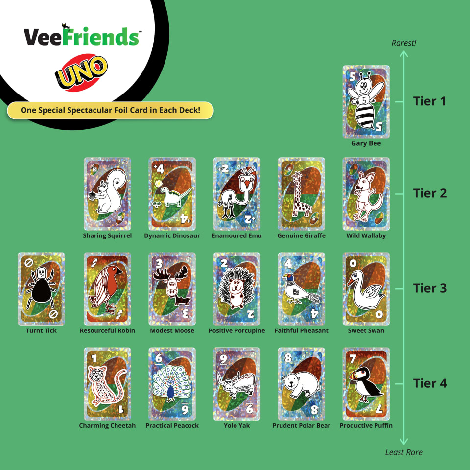 VeeFriends characters come to life in an UNO deck reimagined with 17 VeeFriends signature characters. Find and collect one special spectacular foil card in each deck!