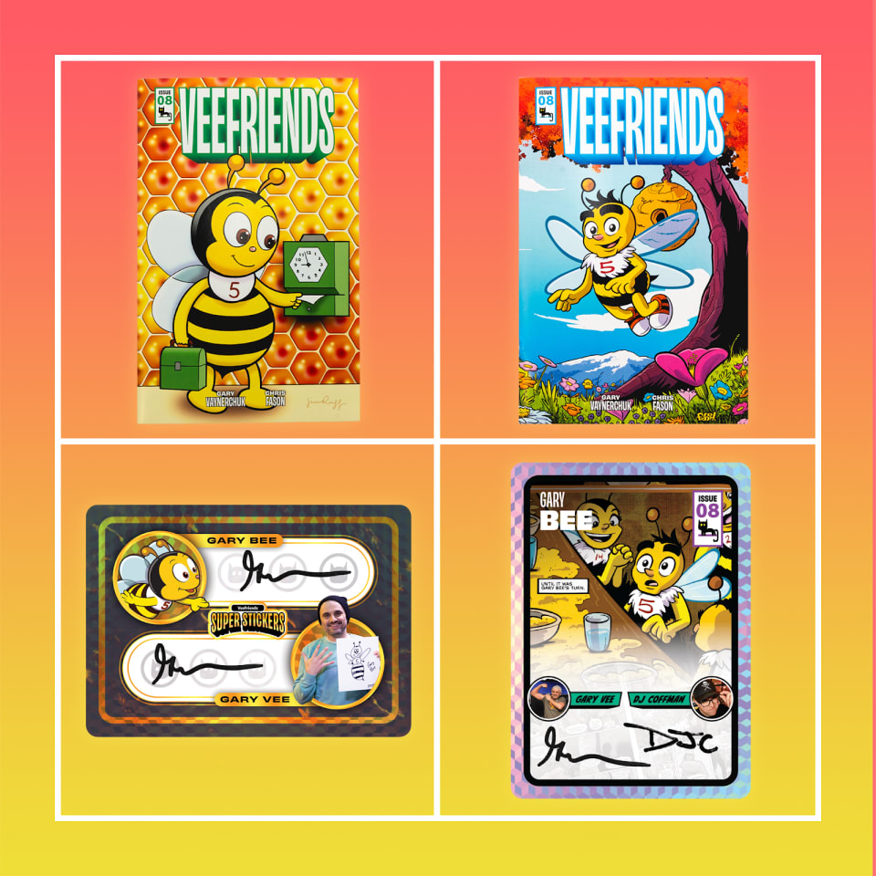 Inspired by VeeFriends creator Gary Vaynerchuk (aka GaryVee), Gary Bee takes centerstage in Comic Book #8, releasing on GaryVee's 50th birthday. Much like Vee, Bee is driven, kind, and always buzzing with energy to help others grow. Comic Book #8 follows Gary Bee on an ordinary day where he uses his empathy and kindness to do extraordinary things.