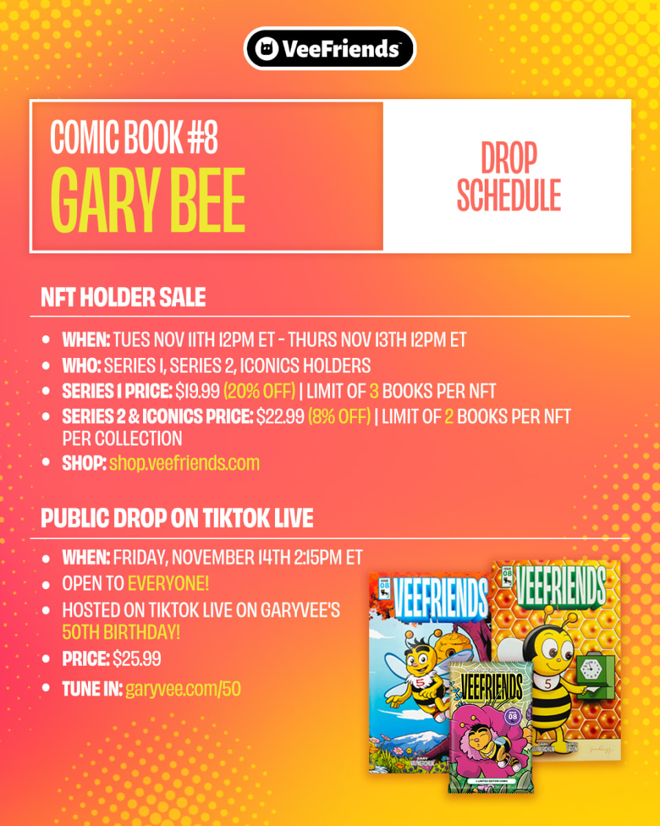 VeeFriends Comic Book #8 will be released in two phases, beginning with exclusive early access for VeeFriends NFT holders, followed by a celebratory public sale release on TikTok LIVE on GaryVee's 50th birthday.