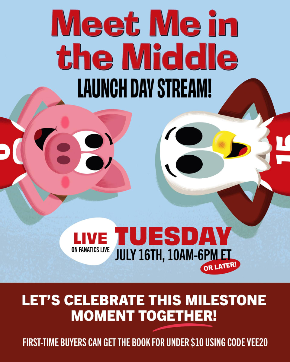 Joining the Meet Me in the Middle Launch Stream on Fanatics Live is free and open to everyone. Simply create a Fanatics Live account and follow the link provided below. First-time buyers, be sure to use the code VEE20 for $20 off your first purchase and to get the book under $10!!
