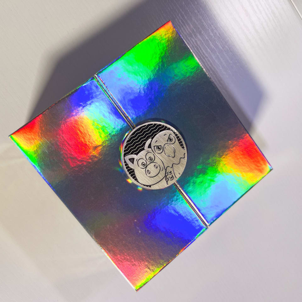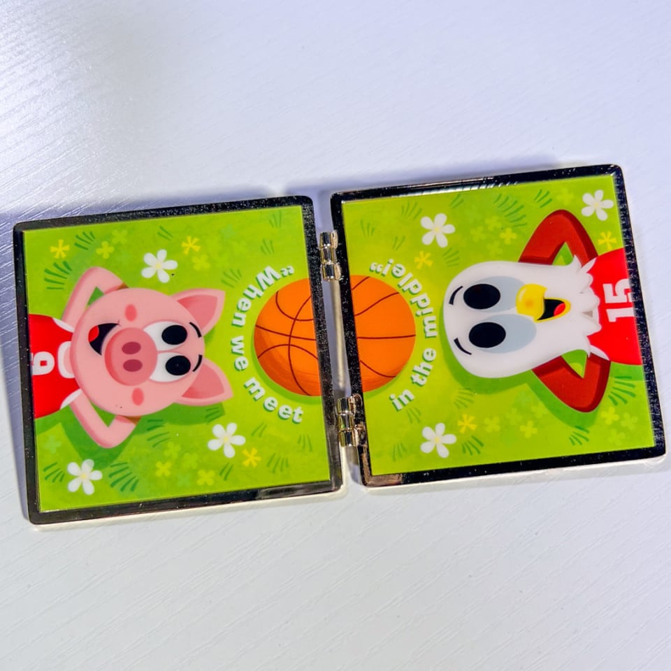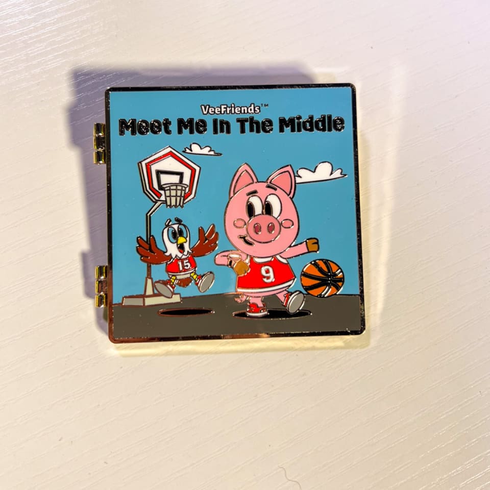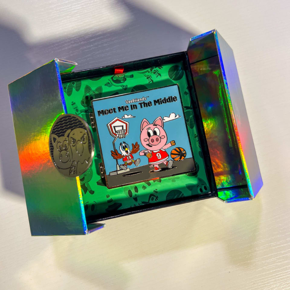 Meet Me in the Middle Booklet Pin: The commemorative collectible for the first-ever VeeFriends children's book, this pin is designed to replicate the book itself, and opens just like a book to reveal Patient Pig and Eager Eagle meeting in the middle! Limited to only 300 ever made, this pin comes packaged inside a premium, holographic box topped with a Patient Pig x Eager Eagle magnetic coin.