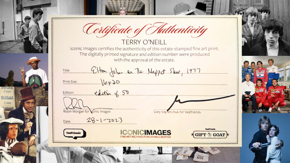 For Gift Goat #11, VeeFriends and Iconic Images have curated a collection of 12 different Iconic Images. For the first time, Gift Goats will be able to select their preferred photograph on a first-come, first-served basis. Each edition sized 16x20 is exclusive to Gift Goat holders, and the photo is an authenticated limited edition out of 50 and will arrive professionally framed. The photos feature a digitally estate-signed from the world-famous Terry O'Neill archives, so you can be sure they are of the highest quality and significance.