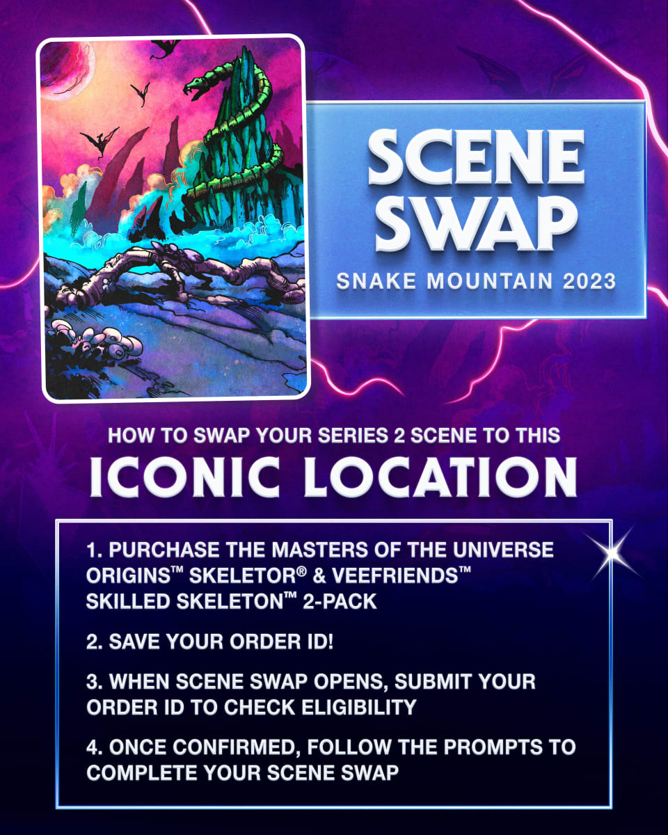 Unlike our previous "Burn Island Scene Swap," this one will not require a burn! Yep, you read that right: NO BURNING IS REQUIRED for this scene swap! Instead of burning, eligibility will be based on the Order ID from purchasing the new Masters of the Universe Origins™ Skeletor® & VeeFriends™ Skilled Skeleton™ 2-Pack.