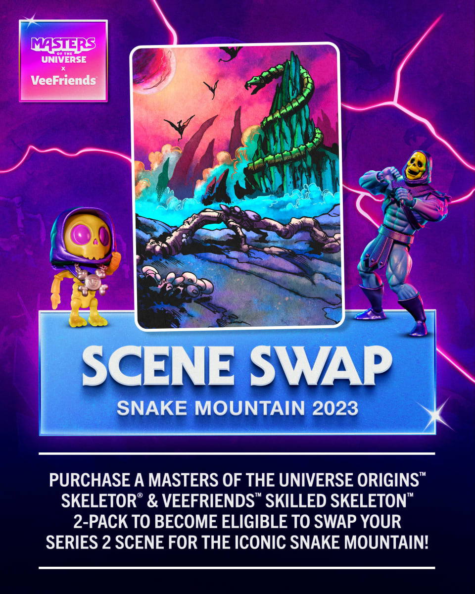 To be eligible for the Scene Swap, you must have purchased the Masters of the Universe Origins™ Skeletor® & VeeFriends™ Skilled Skeleton™ 2-Pack. The product can be bought on 10/6 at 12PM ET via Mattel Creations Website while supplies last. To be eligible for this scene swap, the product must be purchased between October 6, 2023, at 12:00 PM EST - October 23, 2023, at 11:59 PM EST