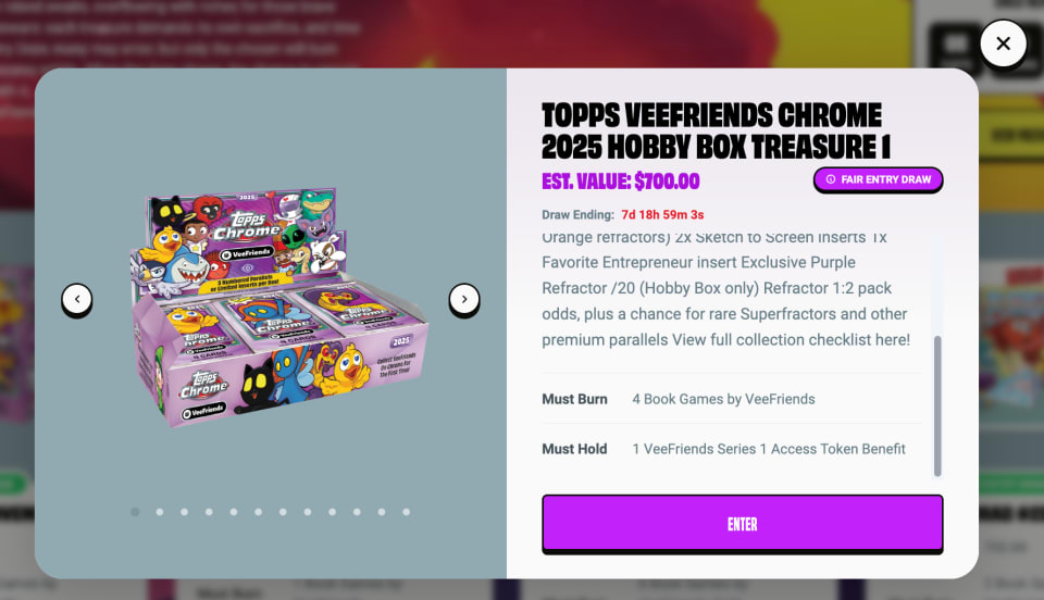 When you find a treasure you're eligible for based on the tokens that you hold, click the tile. You'll see a detailed description, a countdown timer for the draw, and a button that says Enter.