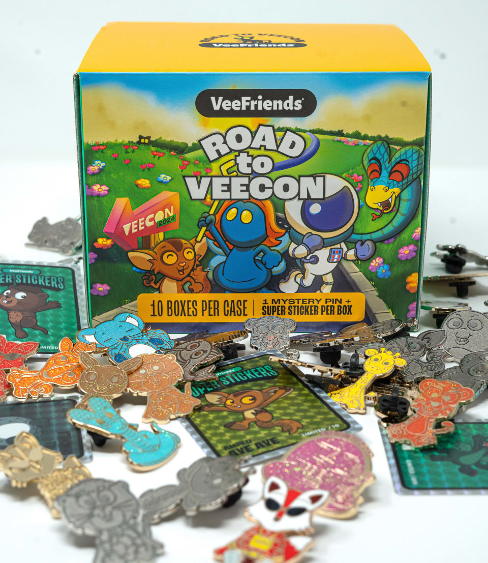 There will be one product available: the Road to VeeCon Mystery Pin + Super Sticker Box. Each box contains a randomized pin and randomized Super Sticker. Customers can purchase individual mini boxes or sealed cases of 10 mini boxes.
