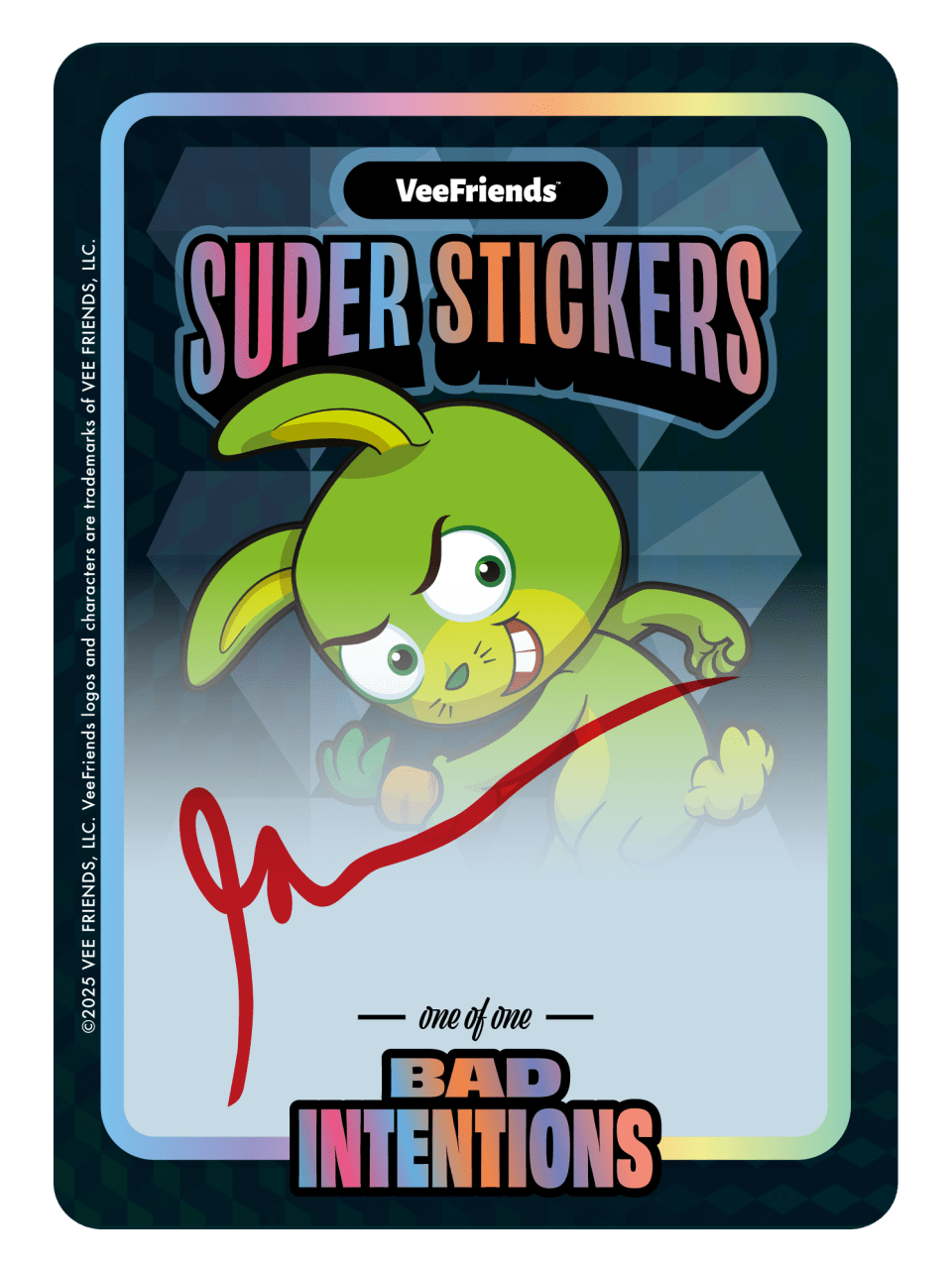 Designed in the iconic manga art style that made the Super Stickers: Manga Series a hit, this collection features expressive poses that showcase the personality of VeeFriends characters. Each sticker combines premium finishes and vibrant designs to elevate your collection, and for the first time ever, Bad Intentions makes his debut as a Super Sticker.