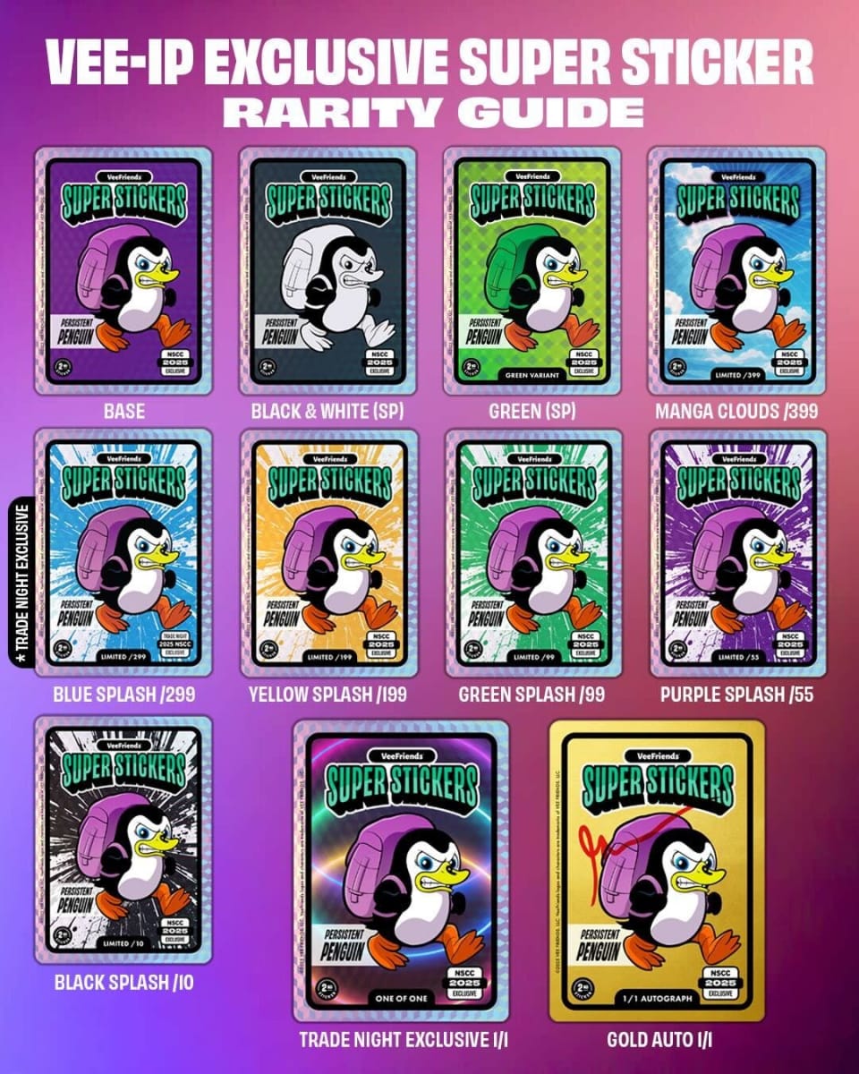 The 2025 National VEE-IP Exclusive Super Sticker Collection will be available only at the 2025 National Sports Collectors Convention in Rosemont, IL, at the VeeFriends Booth and Trade Night Activation.