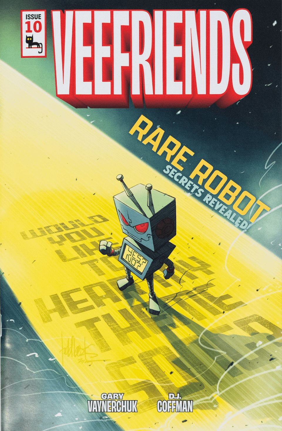 For VeeFriends Comic Book #10, Todd delivered a first for VeeFriends comics: two emotionally charged interpretations of a VeeFriends character within the same base cover concept. Half of the run (1,000 copies) featured Rare Robot with a happy expression, while the other half (1,000 copies) presented Rare Robot in an angry expression, giving collectors two distinct moods to chase.