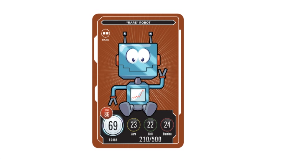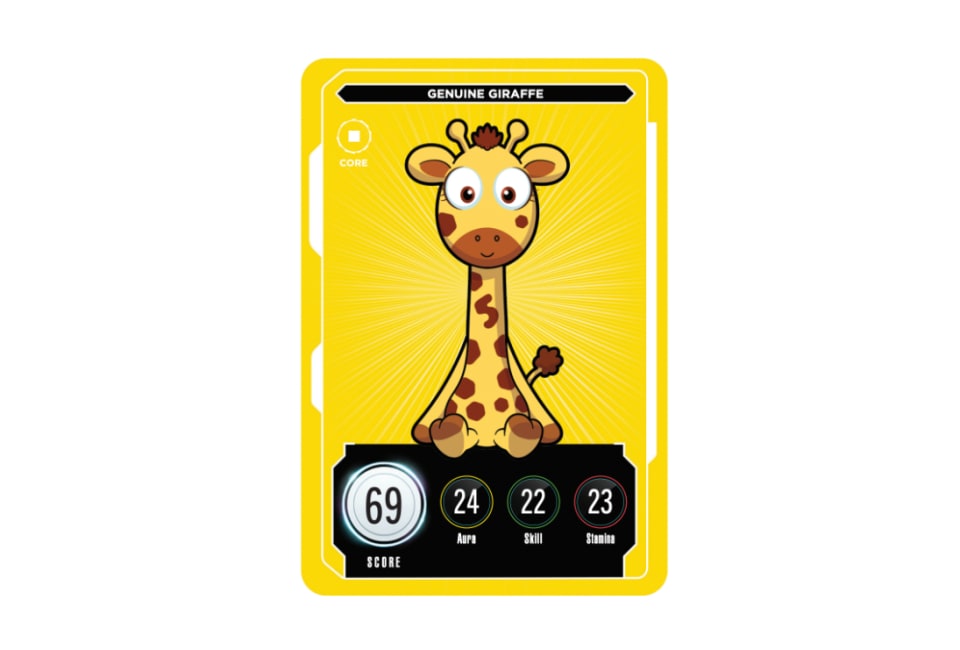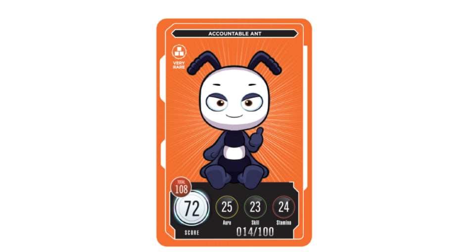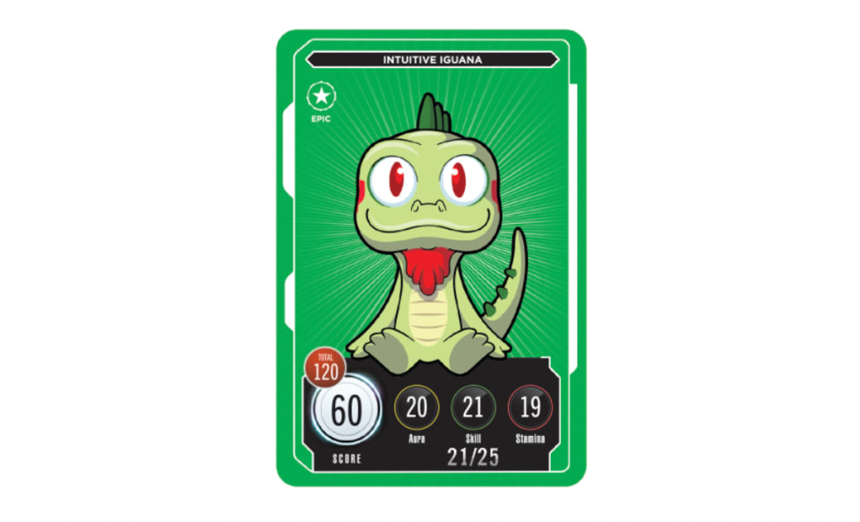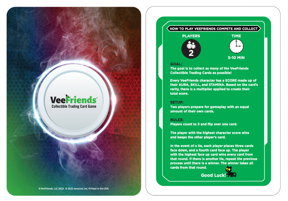 The goal of the trading card game is to collect as many of the VeeFriends collectible cards as possible! Every VeeFriends character has a total SCORE made up of their AURA, SKILL, and STAMINA. Based on the card's rarity, there is a multiplier applied to create their total score.