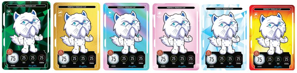 And of course, there are special foil 1/1 spectacular cards for each of the 250 Series 2 characters (besides Gift Goat!) to compete and collect with! The 6 spectacular types per character are Lava, Gold, Bubble Gum, Hologram, Diamond, and the new Series 2 Spectacular, Emerald!