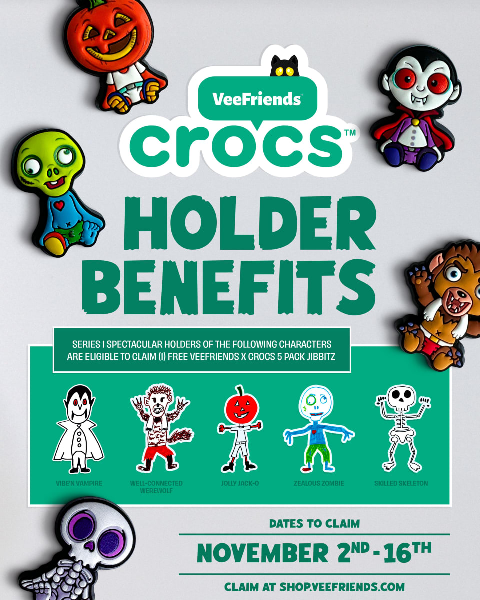 Eligible Series 1 Spectacular holders are eligible to claim one (1) free VeeFriends x Crocs 5 Pack Jibbitz™ Charms.