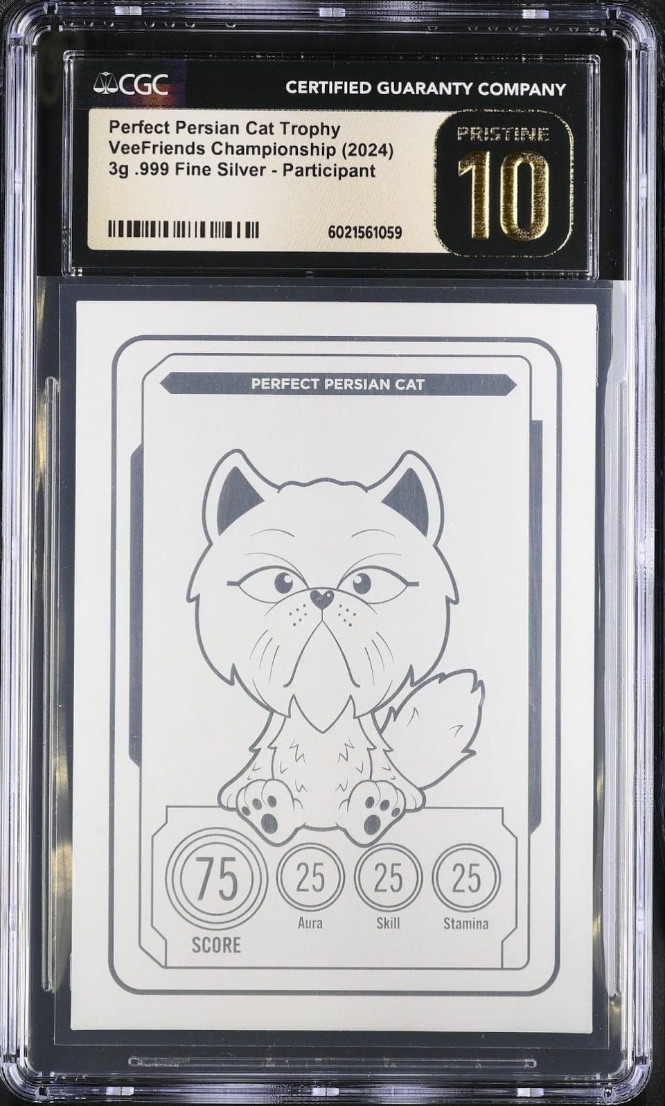 To celebrate this milestone, two trophy cards were created, marking a first for VeeFriends collectibles. Crafted from fine silver and gold, these cards elevate their status as true treasures for players and collectors. Featuring an exclusive twist on the VeeFriends TCG design on the back, each card is as unique as it is stunning. To ensure their authenticity and preserve their value, every trophy card is being professionally graded by CGC. This "perfect" character is celebrated through two exclusive designs: