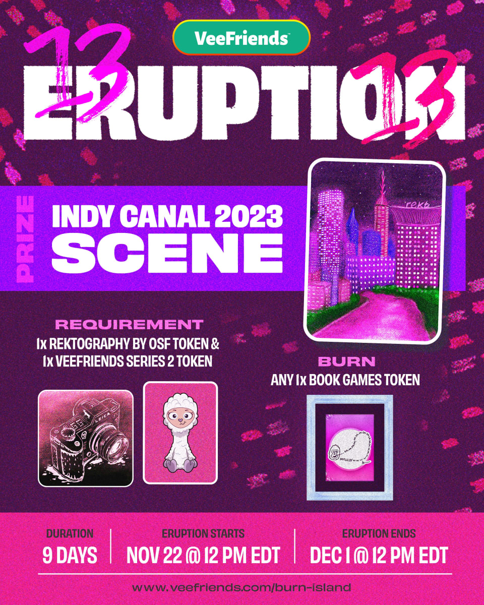This new Series 2 Scene pays homage to VeeCon 2023 in Indianapolis, where OSF participated as a speaker and encapsulates the spirit of the host city. In particular, this Eruption is a heartfelt gesture to those who possess OSF's inaugural collaboration piece with VeeFriends, Gift Goat #11 "Rektography." To participate, individuals must own BOTH "Rektography" and a VeeFriends Series 2 token. This special eruption is a unique memento celebrating the interconnected world of VeeFriends.