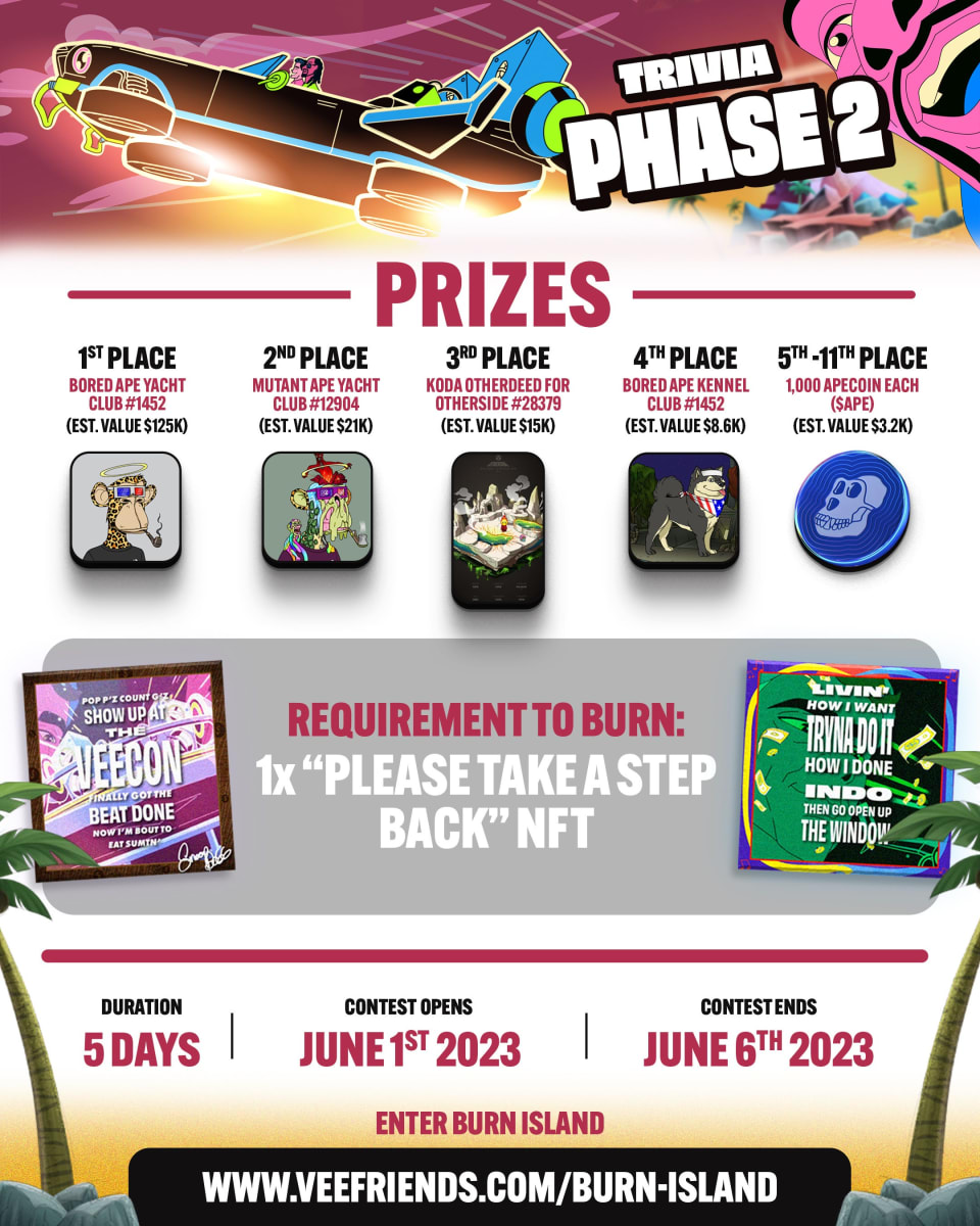 No purchase necessary. Individuals age of majority, current VeeFriends members w/ digital wallet with at least one (1) "Please Take a Step Back" NFT as of 6 PM ET on 6/1/23. Ends 6 PM ET on 6/6/23. Rules at veefriends.com/burn-island/rules.