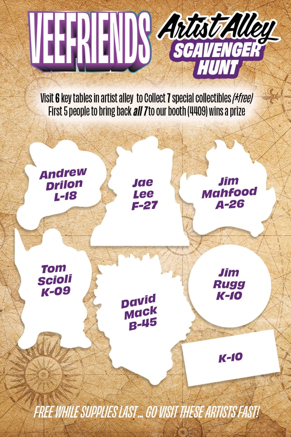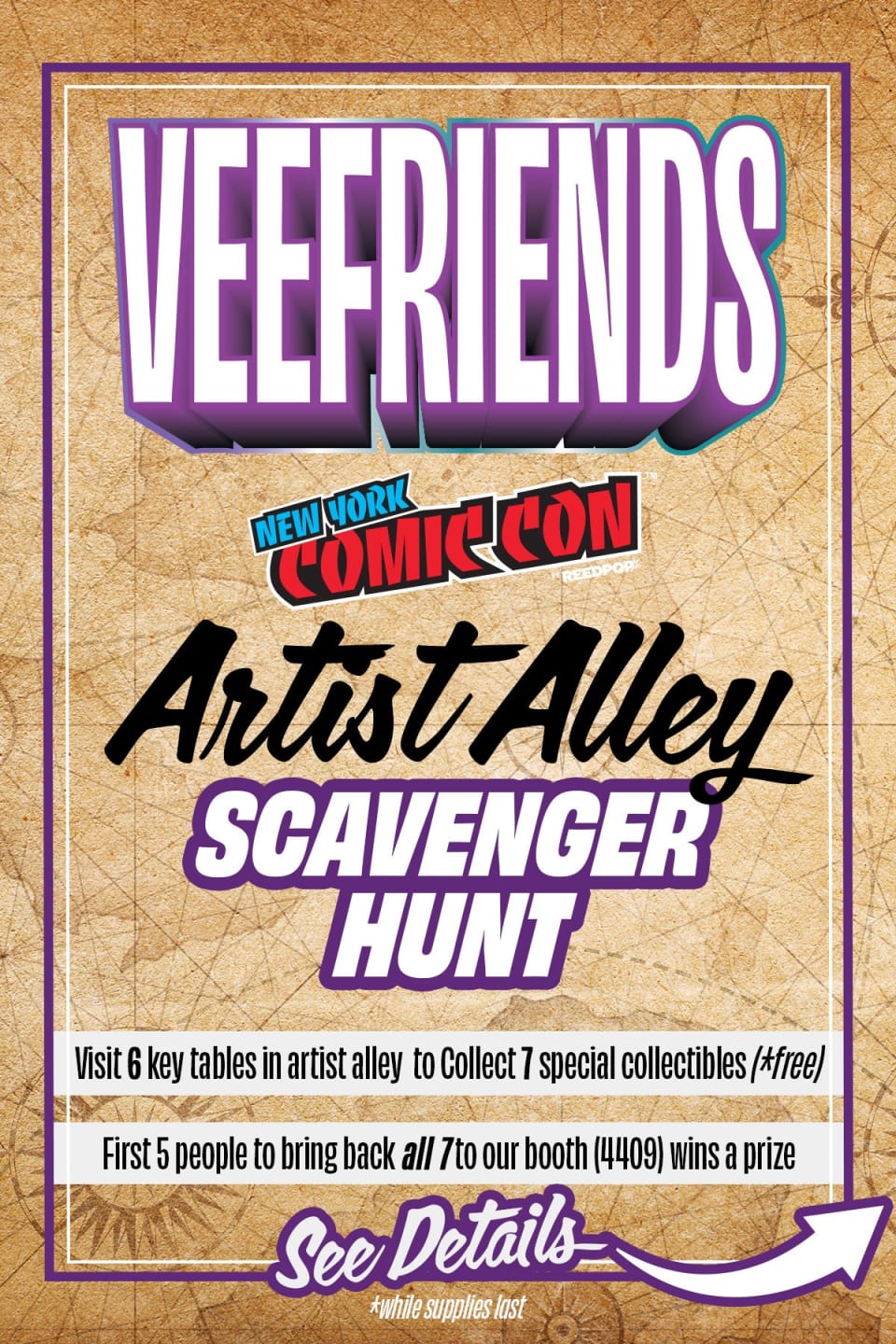 VeeFriends is hosting a special scavenger hunt at NYCC 2025. Visit the tables of our comic book artists in Artist Alley to collect seven free collectibles.