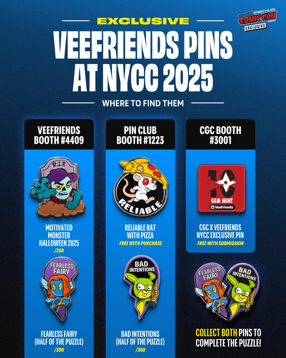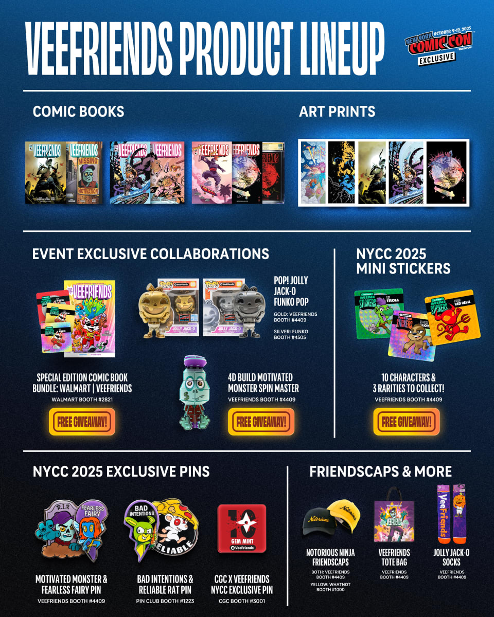 New York Comic Con is one of the biggest stages in the world for collectibles and storytelling, and VeeFriends is returning to the 2025 convention with a major lineup. This year, we're rolling out three exclusive collaborations with major global brands, including Walmart, Funko, and Spin Master, alongside three new comic books, Mini Stickers, Pins, and more. Every drop adds to the expanding VeeFriends universe. Here's the complete guide to every VeeFriends product you can find at NYCC 2025.