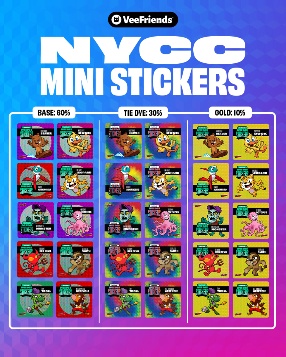 VeeFriends is bringing Mini Sticker Packs to NYCC 2025, a collectible line that stands apart from our Super Stickers while keeping the same spirit of collectibility. Each sealed pack includes one Mini Sticker plus a collector's pamphlet to kickstart your VeeFriends collecting journey. Packs will be available as a free giveaway at the convention. This is a major discovery and onboarding mechanic for the VeeFriends universe.