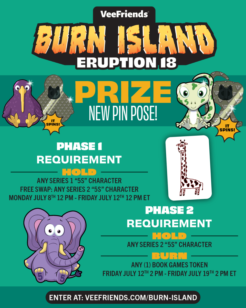 Burn Island is back in action with Eruption 18, featuring the first-ever "Pose Swap" opportunity exclusively for "5s" Character holders on Burn Island! This unique two-phased event allows Series 1 and Series 2 "5s" holders to transform their Series 2 "5s" character's pose into the dynamic "Pin" pose, highlighting a core aspect of the VeeFriends collectible ecosystem.